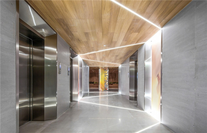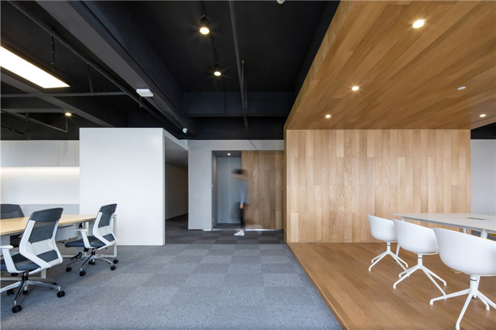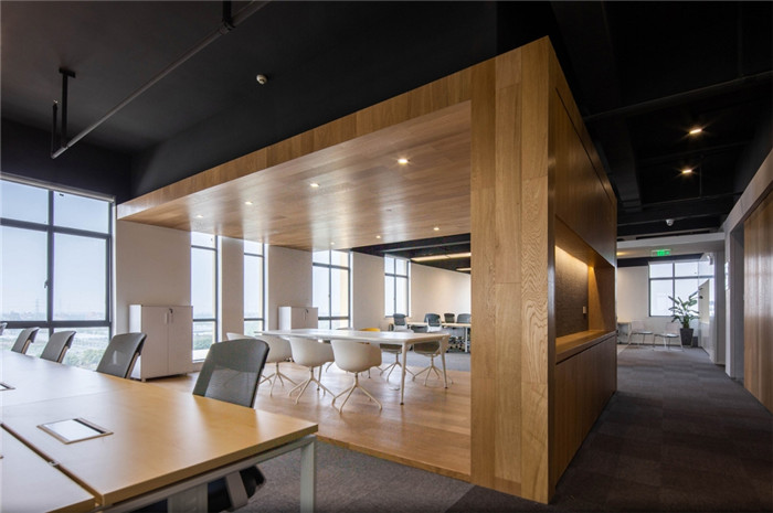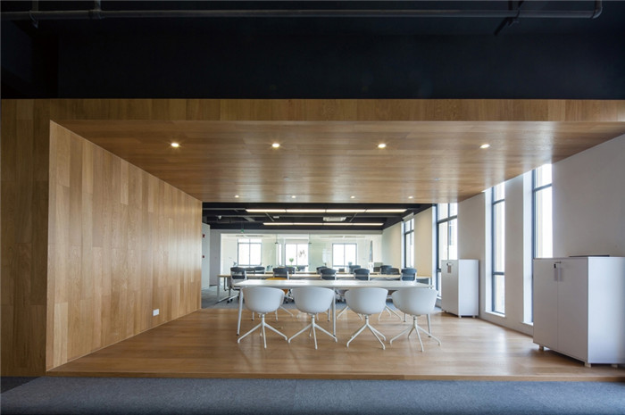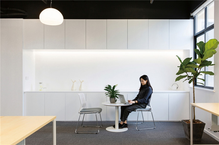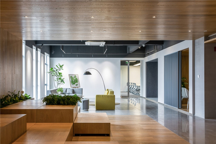設(shè)計打破原本的格局,將更多的開放空間提供給辦公者。去除建筑內(nèi)部承重柱與設(shè)備管井以外的輕質(zhì)隔墻,解放閉塞的隔間,形成開敞的辦公環(huán)境,滿足人數(shù)眾多的電商部集中辦公。通過“盒子”形體的組接與排列,重組了立柱與井道密布的區(qū)域,形成了對應(yīng)大空間功能的輔助綜合區(qū)。結(jié)合接待區(qū)與生活區(qū)的布置,營造了自然、積極、高效、專注,并有歸屬感的辦公氛圍。
