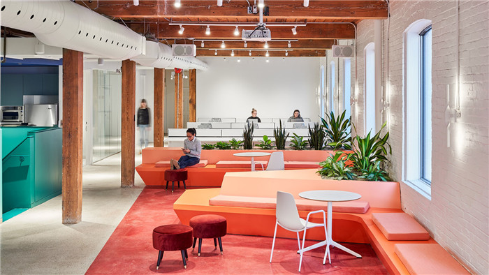 鮮明的白色辦公空間與現(xiàn)有建筑的歷史木結(jié)構(gòu)和磚結(jié)構(gòu)形成鮮明對比。干凈安靜的工作空間被豐富多彩的社交和協(xié)作空間所打破。環(huán)形的長椅是整個(gè)空間的重復(fù)主題,參考公司的新標(biāo)識——笑的符號。綠色植物的點(diǎn)綴給辦公室增添了溫暖和柔和。辦公室裝修設(shè)計(jì)使用的三種顏色——珊瑚色、祖母綠和海軍藍(lán)——作為非正式的尋路工具,引導(dǎo)工作人員和游客感受每個(gè)空間的氛圍,從社交到安靜和沉思。