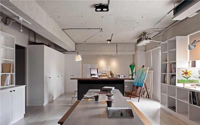 二樓是同事的辦公地點,以簡單的基底加上書柜,讓文件和書本都有足夠的空間可以收納。樓上為總監的發想兼夢想畫室,天花板呈原始裸露狀,沒有特定風格的束縛,當同事們缺乏靈感,就能回到最純粹的原點,隨意翻閱設計書,拿著咖啡坐在「發想吧」輕松聊想法、激蕩創意。