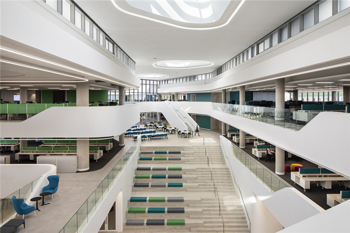辦公樓裝修設計團隊通過優化內部功能動線和部門互動,去培養創造性、創新性和協作型的公司文化。一樓和二樓為開放工作區,這里沒有明顯的等級結構和封閉的隔間。因為采用ABW工作理念,整個建筑采用高架地板以便于后期的維護和未來空間的升級服務。每個樓層都擁有四大“核心”空間,包括廚房、會議區、休閑區、儲物柜、浴室和消防通道等功能設施,用于增強各樓層部門之間的互動和協作。