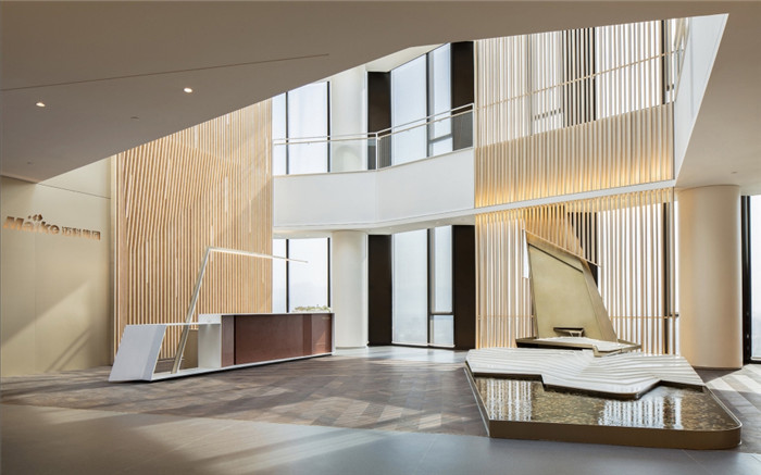 接待臺(tái)設(shè)計(jì)將力學(xué)美感、視覺(jué)張力及照明結(jié)合在一起,作為功能部分融入公共空間,條柵背景上點(diǎn)綴的豎向水晶制條棒,像雨線滴下,延續(xù)落入水景裝置中,將接待臺(tái)背景空間與裝置藝術(shù)結(jié)合在一起。