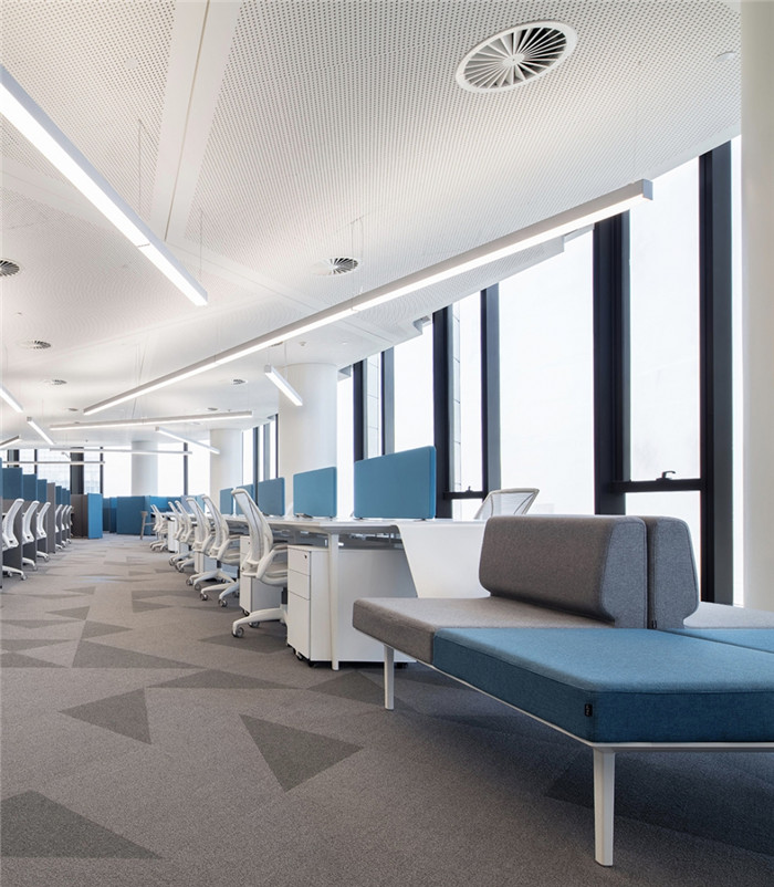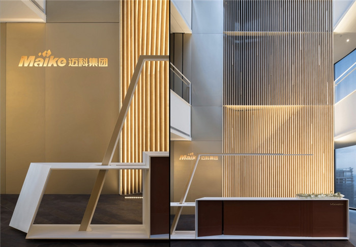 整體辦公設(shè)計(jì)表現(xiàn)運(yùn)用了大量的折線、三角形、線型等幾何形狀,通過(guò)部分圓角處理繼續(xù)呼應(yīng)邁科中心建筑設(shè)計(jì)特征,主要表現(xiàn)在每層室內(nèi)功能布局方式、材料輪廓形狀及肌理形狀、裝飾燈具形狀及光氛圍、家具布置形式及面料質(zhì)感等方面。延承邁科中心建筑及室內(nèi)公共空間設(shè)計(jì)表達(dá),將邁科集團(tuán)辦公公共空間裝置設(shè)計(jì)與建筑中絲綢之路空中紐帶構(gòu)架設(shè)計(jì)語(yǔ)言聯(lián)系在一起。
