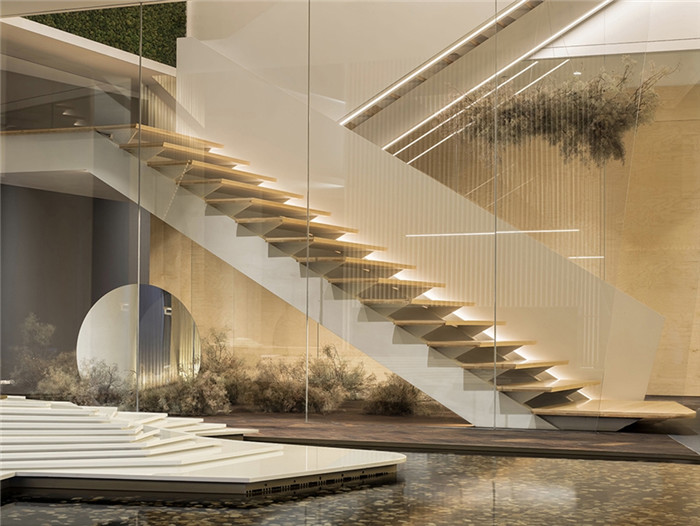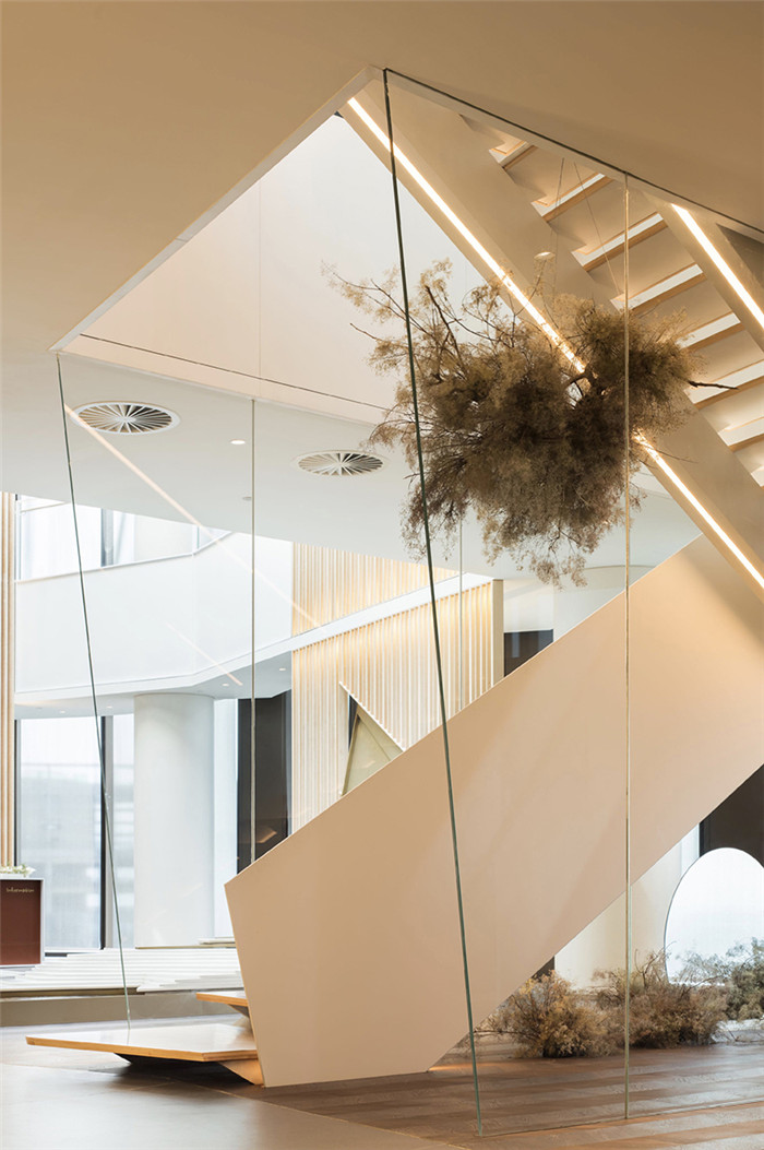 樓梯作為垂直交通功能,是連接上下樓層的重要部分。將玻璃覆蓋樓梯兩側(cè)保障安全性的同時(shí)也可以將白色鋼板和木踏面的精致和諧之美傳遞到公共空間中,將自然綠色植物設(shè)計(jì)在每層樓梯的轉(zhuǎn)折平臺(tái)空間,帶給人們的自然愜意輕松的內(nèi)心感受。