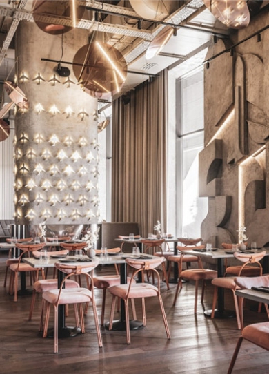 標簽: 集團總部辦公設計 辦公樓裝修設計方案 READ MORE設計的想象力是無極限的,跨越時空,可以向外太空索取靈感。Polet餐廳的內部裝潢讓人仿佛置身科幻電影的場景之中。入口光滑的鋼結構和舷窗使房間看起來就像航天飛船的機艙。極簡主義風格的Polyot餐廳內部并未采用莫斯科餐廳中常見的圖案裝飾,而是用懸掛的閃亮大型物件加以替代。下面就跟隨鄭州餐廳裝修設計公司宏鈺堂小編一起來欣賞吧! 常常出現在好萊塢新世界電影中的銀色火星女神也以雕像的形式被設置在