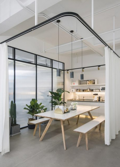 標(biāo)簽: 辦公室裝修方案 現(xiàn)代工業(yè)和東方自然共存的辦公室裝修 READ MORE十間工作室的室內(nèi)設(shè)計(jì)意在營(yíng)造一種干凈、明亮、寬松的創(chuàng)意氛圍,同時(shí)兼顧空間和功能的多變及靈活性。下面鄭州辦公室裝修公司宏鈺堂裝飾就帶大家一起欣賞一下。 工作室以黑白色調(diào)為主,采用開放式天花和素混凝土地面,暗示了極簡(jiǎn)、中性的設(shè)計(jì)哲學(xué)。室內(nèi)辦公區(qū)形成一個(gè)流動(dòng)、通透的Studio式大空間,不設(shè)任何全封閉的隔間。會(huì)議室、辦公室均采用瓦楞藝術(shù)玻璃折疊門,平時(shí)完全開敞,僅在有需要時(shí)關(guān)閉,提供視覺和聲學(xué)的私