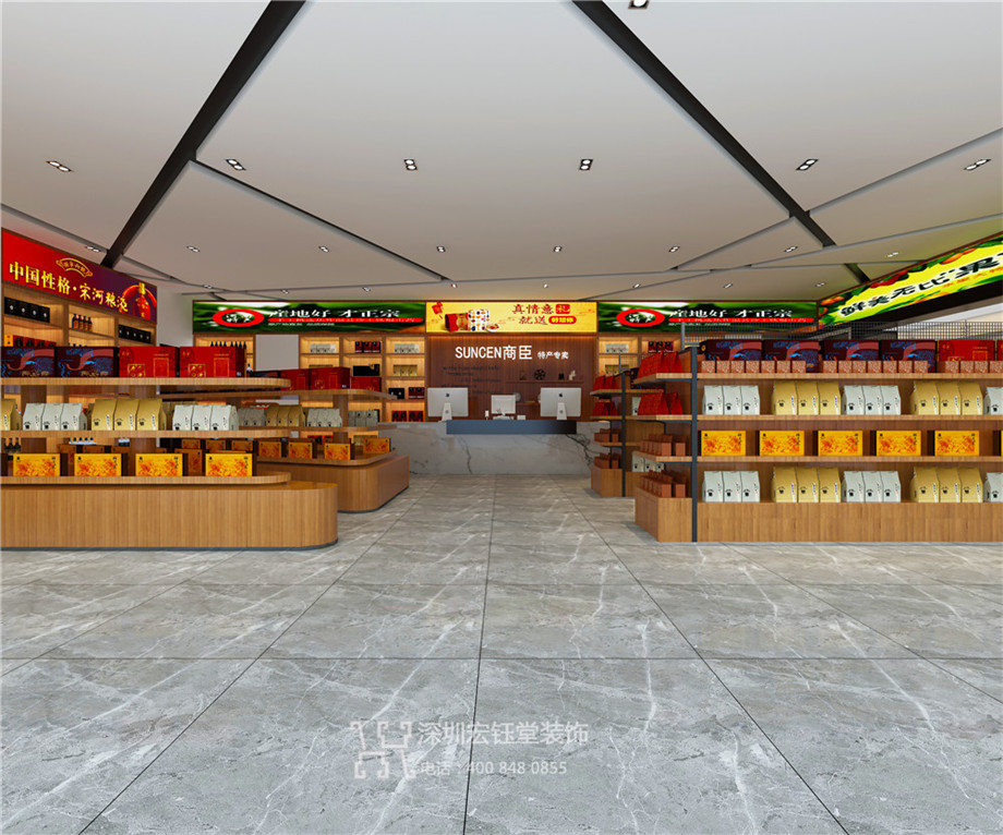 商臣特產正大樂城店是商臣連鎖便利店旗下首家以各色特產為主的專賣店,依托高鐵站龐大的人流量,希望帶給人們不一樣的購物新體驗。鄭州專業商業店面裝修公司宏鈺堂裝飾以精品店的概念打造整個銷售空間,明亮通透的全景落地玻璃將店內形象最大限度是展示給過往客戶,全木質打造的貨架在燈光的映襯下十分溫潤,簡約明快的室內設計風格營造輕松怡人的購物氛圍。
