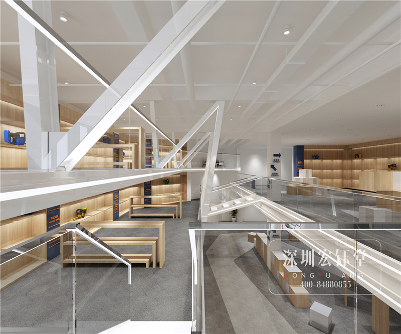 辦公樓的四樓和五樓是雙層挑空設(shè)計(jì),為展廳提供一個(gè)開闊、張弛有度的空間。結(jié)合園林器械經(jīng)典產(chǎn)品尺寸,宏鈺堂以可變性、兼顧性來規(guī)劃空間,打造一個(gè)滿足展示數(shù)量、靈動(dòng)多變兼具藝術(shù)魅力的展示空間。