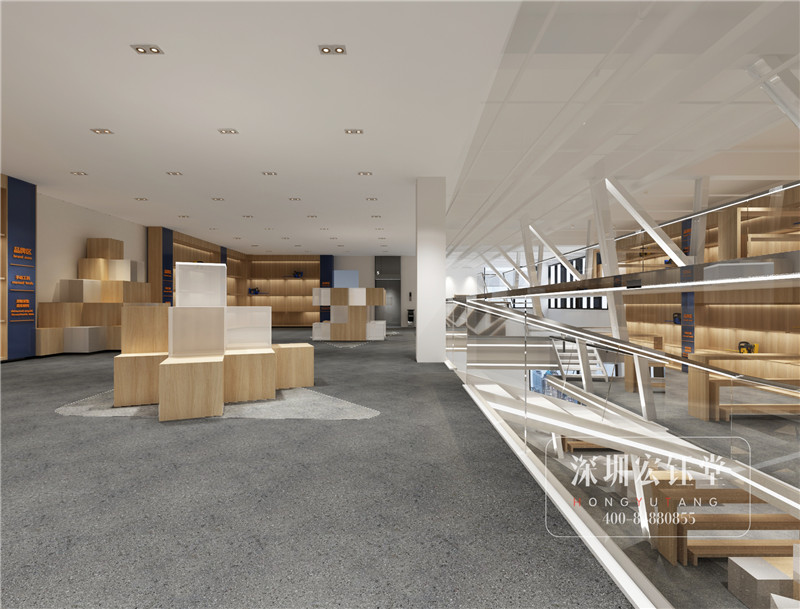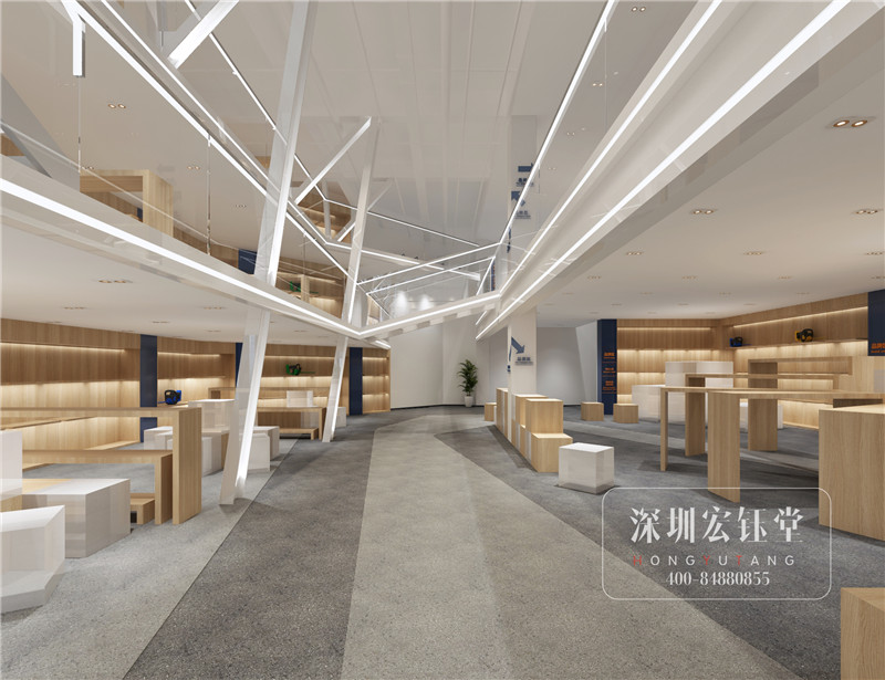 我們常說“山巍峨,水靈動(dòng)”,如何在空間中表現(xiàn)靈動(dòng)呢?宏鈺堂商業(yè)展廳裝修設(shè)計(jì)公司從交通動(dòng)線、產(chǎn)品展示兩方面入手。地面以“曲水流觴”為主題引入,以白、灰兩種色彩的塑膠地板拼接,引領(lǐng)人們進(jìn)入展示空間。展示區(qū)域以“積木盒子”為主題,根據(jù)展示機(jī)型定制尺寸并可以根據(jù)需要隨時(shí)移動(dòng)和拼接。